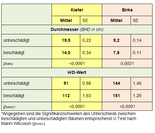 Die Schäden betrafen bei beiden Baumarten vor allem schlanke Bäume und bestätigen damit die Erfahrungen aus früheren Untersuchungen an Kiefern. Im Vergleich zum Kollektiv der unbeschädigten Bäume zeichneten sich beschädigte Kiefern oder Birken durch im Mittel signifikant geringere Durchmesser beziehungsweise signifikant höhere H/D-Werte aus (Tab. 2).