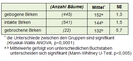 Für Birke wurde differenziert, inwieweit der H/D-Wert möglicherweise damit zusammenhängt, ob die Bäume gebrochen oder gebogen worden waren. Für die vom Schnee gebogenen Bäume ergab sich dabei ein eindeutiges Ergebnis. Die H/D-Werte dieser Birken lagen statistisch hoch signifikant (Signifikanzniveau < 0,5%) sowohl über denen der intakten als auch der gebrochenen Birken (Tab. 3).
