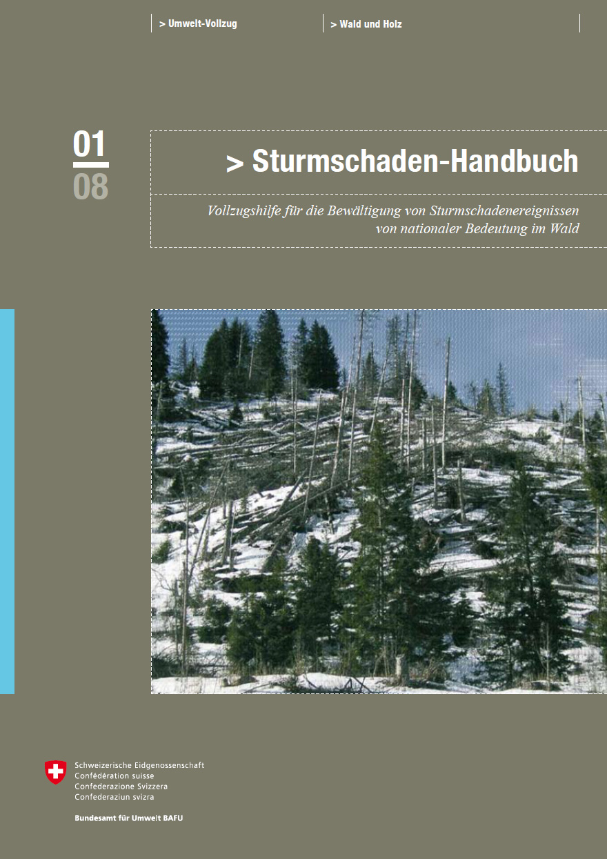 Das Bundesamt für Umwelt BAFU hat bereits 1984 erstmals ein "Waldschaden-Handbuch" herausgegeben, das zahlreiche praktische Tipps für die Sturmschadenbewältigung enthielt. Nach dem Sturm "Vivian" (1990) wurde das Werk überarbeitet und 1993 in der 2. Auflage veröffentlicht. Nun liegt die dritte Auflage mit den Erkenntnissen aus "Lothar" (1999) vor, die den präziseren Titel "Sturmschaden-Handbuch" trägt.