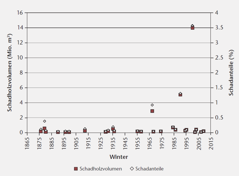 23 der 26 Winterstürme haben Schadholzmengen von weniger als 2 Mio. m3 verursacht, und nur drei liegen über dieser Zahl. Diese drei Stürme hinterliessen Schäden von circa 2.9 Mio. m3 (1967), 5.1 Mio. m3 (Vivian vom Februar 1990) und 14 Mio. m3 (Lothar vom Dezember 1999). Dabei ist der grösste beobachtete Schaden 20-mal so gross wie die untere Erfassungsgrenze für diese Studie.