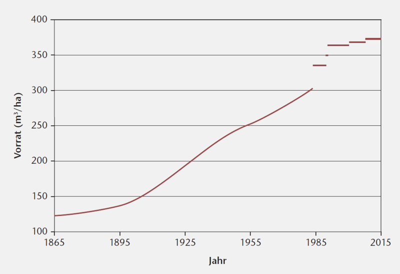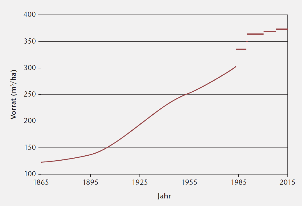 Abb. 5 - Entwicklung der Bezugsgrösse Vorrat pro Hektare. Die Werte vor 1982 sind modelliert und damit besonders für die frühen Jahre mit Unsicherheit behaftet: 1865 bis 1982: hypothetischer Vorrat gemäss Kurz et al (1998), ab 1983 Vorrat (der lebenden Bäume) pro Hektare gemäss Landesforstinventar (Auswertungseinheit: gemeinsamer zugänglicher Wald ohne Gebüschwald LFI1–LFI4b).