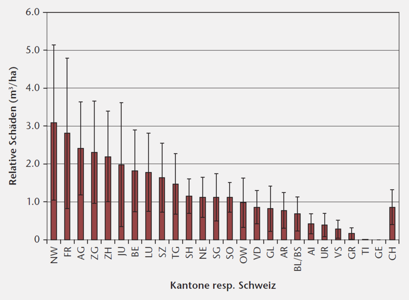 Abb. 6 - Relative Schäden (Schadholzvolumen pro Hektare Waldfläche) pro Kanton und für die Schweiz. Angegeben sind der Mittelwert und die Standardabweichung der 26 schweren Winterstürme (Schaden ≥70'000 m3 je Ereignis) von 1865 bis 2014 in der Schweiz.