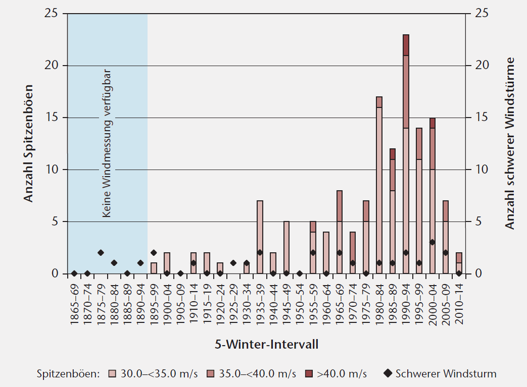 Abb. 4 - Anzahl täglicher Spitzenböen ≥30.0 m/s an der SwissMetNet-Station Zürich Fluntern (ab Periode 1895–1899) und Anzahl schwerer Winterstürme (Schaden ≥70'000 m3 je Ereignis; ab Periode 1865–1869) je 5-Winter-Intervall.