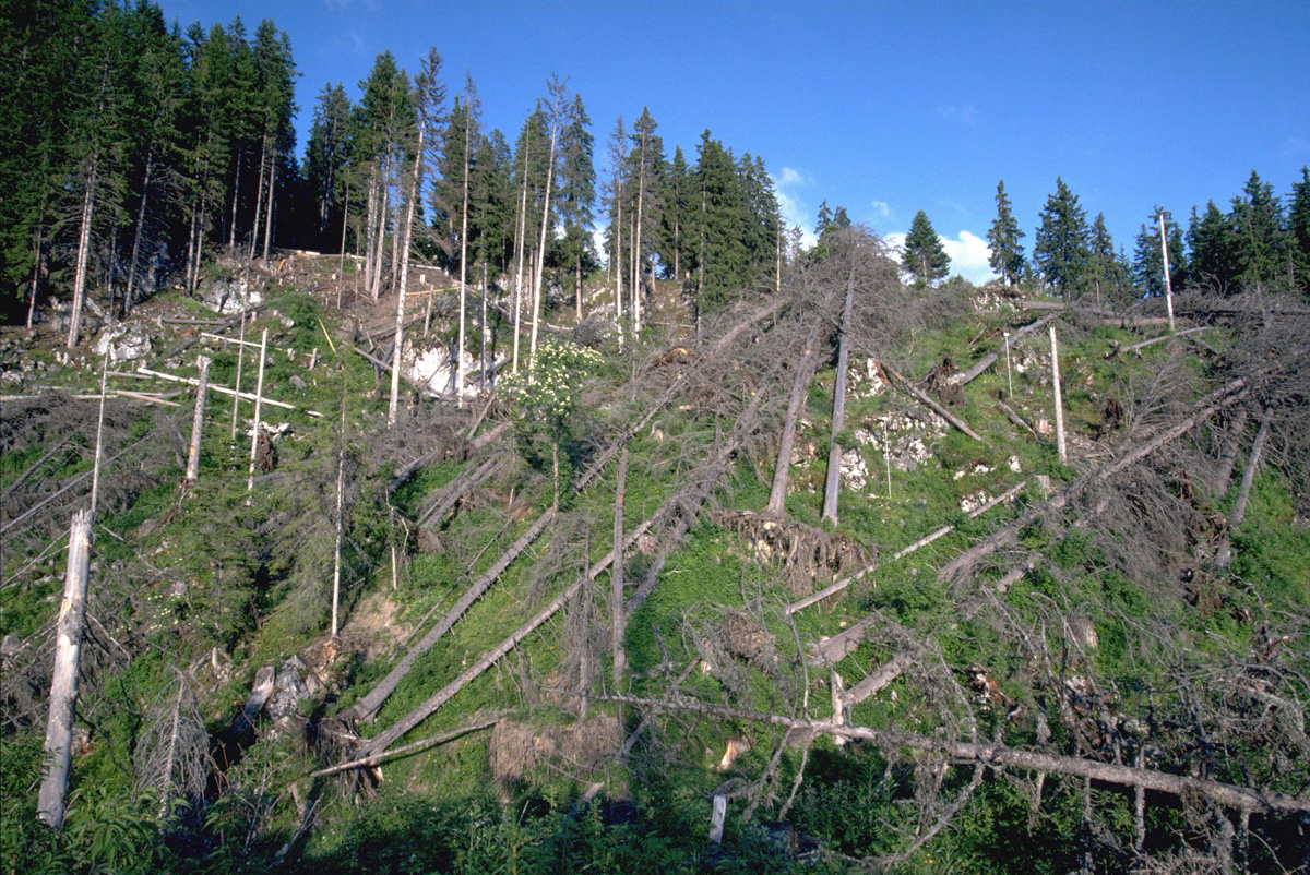 Das Risiko für den Wald, von einem Wintersturm geschädigt zu werden, ist indes nicht nur vom Sturm, sondern auch von vielen anderen Faktoren abhängig, insbesondere von der Baumhöhe, mit der der stehende Vorrat stark korreliert ist. Am Anfang des Studienzeitraumes war dieses Risiko bei mittleren Vorräten von weniger als 150 m3/ha wesentlich geringer als heute, wo die Wälder im Durchschnitt einen Vorrat von 374 m3/ha erreichen. Sowohl die absoluten als auch die relativen Schadholzmengen haben in den vergangenen 150 Jahren stark zugenommen, ein Trend, der nicht nur in der Schweiz, sondern auch in ganz Europa feststellbar ist. Das Ausbleiben rekordhoher Sturmschäden in den vergangenen 15 Jahren hat demzufolge damit zu tun, dass die Schweiz nur marginal von weiteren grossen Winterstürmen getroffen wurde. Geringere Holzvorräte würden das Schadenpotenzial bei ähnlich hohen Windstärken wie während Lothar wohl deutlich reduzieren.