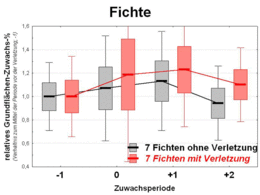 Vor dem Hintergrund dieser Befunde ist davon auszugehen, dass holzerntebedingte Rindenschäden nicht unmittelbar zu Zuwachseinbußen führen. Zumal umfangreiche Untersuchungen in Finnland bei Fichte zu vergleichbaren Ergebnissen kamen und sich keine Hinweise auf Zuwachsrückgänge unmittelbar nach Verletzungen der Rinde fanden.