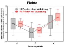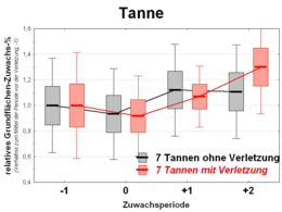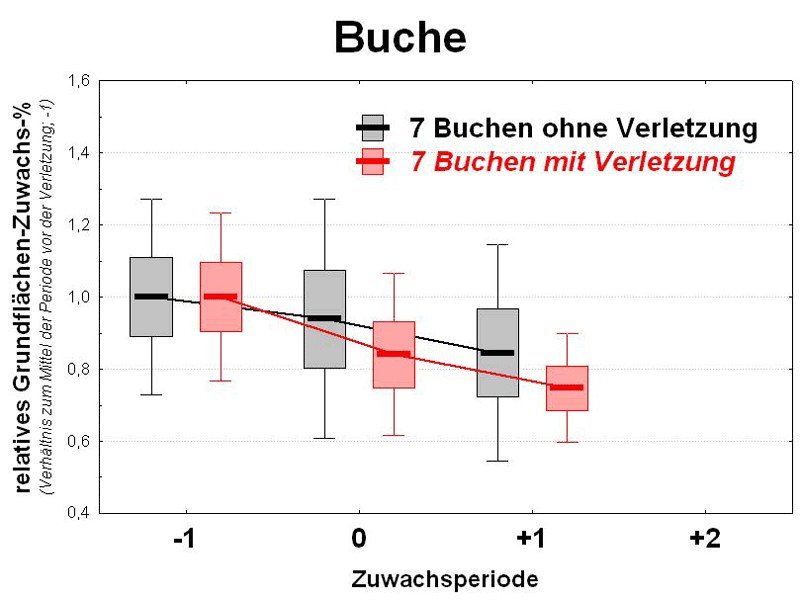 Zwar ist es prinzipiell durchaus denkbar, dass sich mit Verletzungen der Rinde verbundene Heilungsprozesse und/oder Störungen im Bereich der wasserleitenden Gewebe auch auf den Zuwachs auswirken könnten. Dies müsste sich dann in der Folgezeit nach der Verletzung in Form abweichender Zuwachsverläufe im Vergleich zu Bäumen mit intakter Rinde ausdrücken. Darauf geben die Zuwachsanalysen jedoch keinerlei Hinweise: Die Zuwachsveränderungen verlaufen bei beiden Kollektiven – den Bäumen mit Rindenverletzungen und den Bäumen mit intakter Rinde – in allen betrachteten Perioden gleichsinnig. Weder im Jahr der Verletzung (Periode "0") noch in den auf die Verletzung folgenden Perioden ("+1" bzw. "+2") ergeben sich statistisch signifikante Unterschiede zwischen diesen beiden Kollektiven; dies gilt für die Bäume mit den nachgeahmten und mit den "echten" Rindenschäden (Abb. 1 und 2).