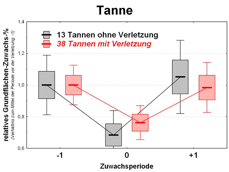 Signaturen: fetter waagerechter Strich: Mittelwert, Box: Standardfehler des Mittels, senkrechter Balken: 95 % Konfidenzintervall. In keiner Zuwachsperiode sind die Unterschiede zwischen den verletzten und unverletzten Bäumen statistisch signifikant (p < 30%).