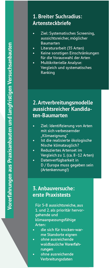Für ein gegenüber den Steckbriefen reduziertes Artenset sollen in diesem zweiten Schritt klimadynamische Artverbreitungsmodelle auf Grundlage großräumiger, europäischer Verbreitungsdaten erstellt werden. Schließlich werden in einem dritten Schritt für eine noch weiter reduzierte Anzahl an Baumarten noch Anbauversuche angelegt. Die Auswahl der Arten für diese Versuche basiert wiederum auf den Ergebnissen der Artensteckbriefe und der Artverbreitungsmodelle.