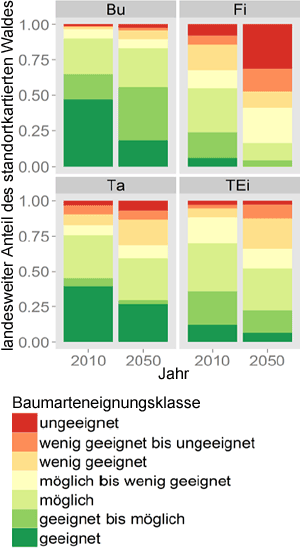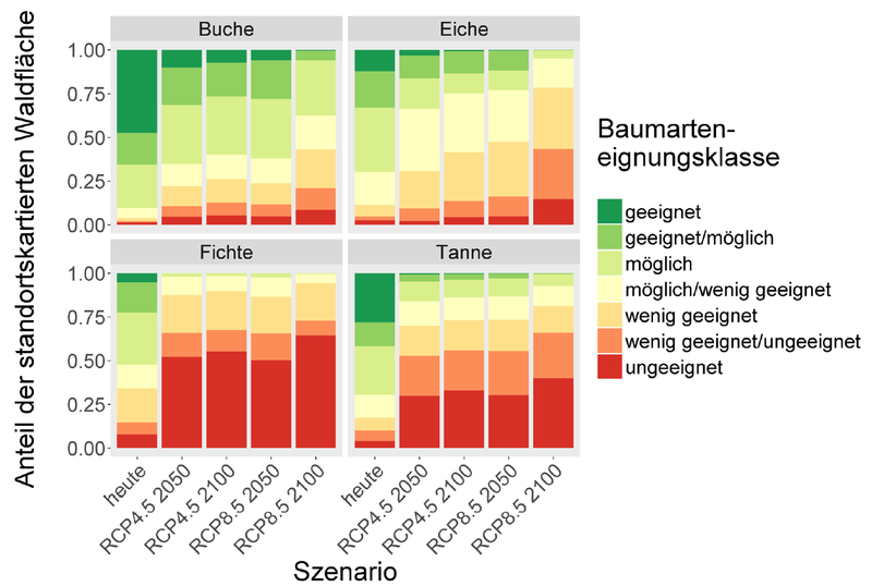 Dabei ist diese Abnahme bei Fichte überwiegend durch steigende Anteile der schlechtesten Eignungsstufen charakterisiert (rote Kategorien). Umgekehrt fällt bei Buche, Tanne und Traubeneiche überwiegend eine Abnahme der besten Eignungsstufen ins Auge (grüne Kategorien).