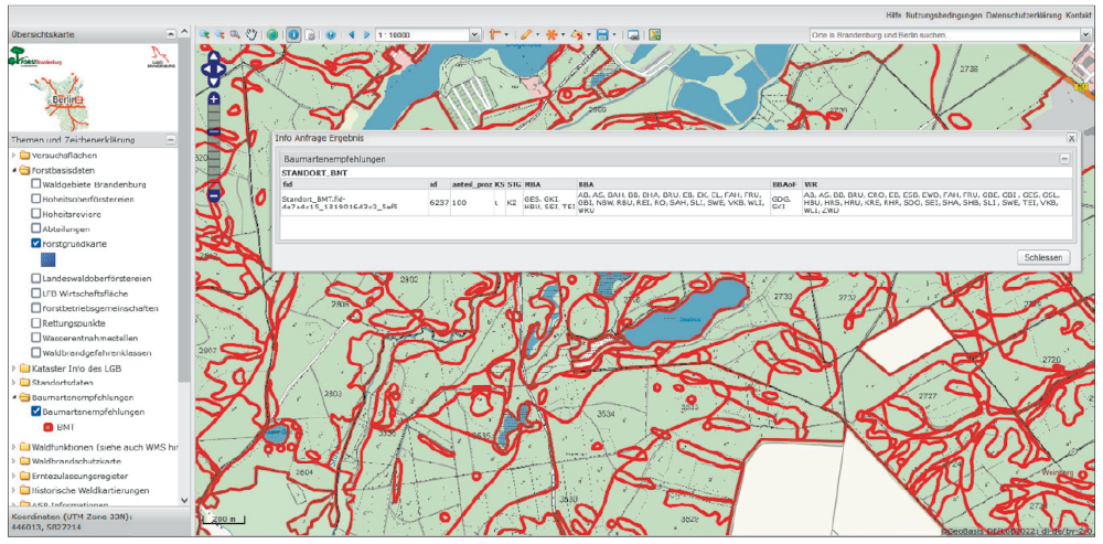 Abb. 1. Die Baumartenempfehlungen im Geoportal (Bildschirmansicht). https://www.brandenburg-forst.de