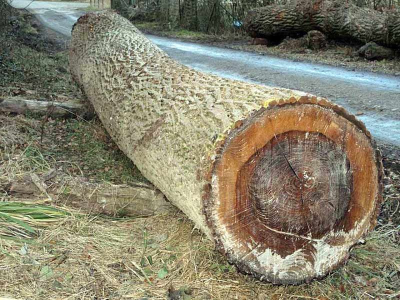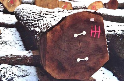 Abb. 15: Intermedianuss-Furnierstamm, Gemeindewald Vogtsburg am Kaiserstuhl. Alter etwa 65 Jahre, Länge 6,3 m, Mittendurchmesser 65 cm ohne Rinde, Volumen 2,09 Fm, Erlös 1.709 €/fm. (Foto: Andreas Ehring)