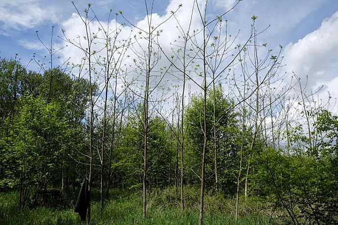 Das einphasige Pflegemodell entspricht dagegen den Anforderungen schnellwachsender Buntlaubhölzer mit unzureichender natürlicher Astreinigung, an eine frühe Förderung des Kronenausbaus und einer gleichzeitigen Qualitätssicherung durch Grünästung (Richtlinie Landesweiter Waldentwicklungstypen Baden-Württemberg 2014). In der Kulturphase genügen deutlich weniger Pflanzen als im zweiphasigen Pflegemodell. Mit weiten Reihenverbänden oder einer Trupppflanzung (Abb. 9) wird nicht nur die Pflanzenzahl deutlich reduziert, sondern auch der Pflegeaufwand.
