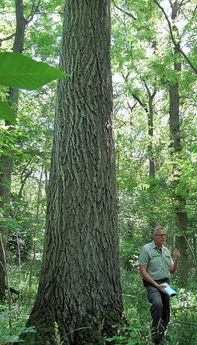 Ein sehr beeindruckender Nusshybride steht im Steiner Wald, Forstamt Lampertheim (Abb. 4). Die etwa 115jährige Juglans intermedia hat einen Brusthöhendurchmesser von 120 cm und ein errechnetes Stammvolumen von 12 VFm.