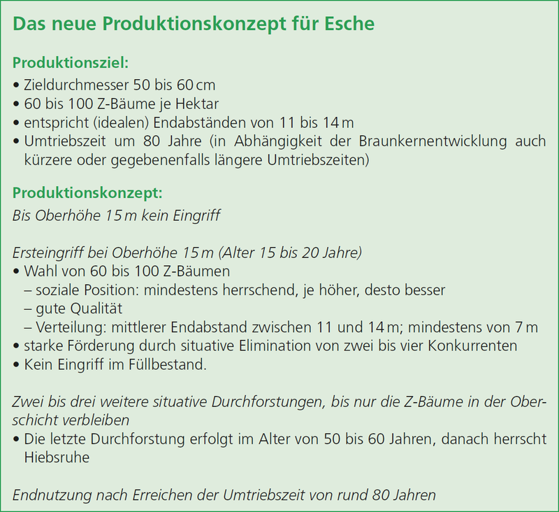 Weil der Eschenbraun- bzw. Buchenrotkern hauptsächlich vom Alter abhängt, sollte eine Produktionszeit von 80 (Esche) bzw. 120 Jahren (Buche) nicht überschritten werden. Dieses Produktionsziel lässt sich mit unbehandelten Beständen nicht erreichen: In einem ungepflegten Eschenbestand wären die Z-Bäume im Alter von 80 Jahren rund 40 cm dick; in einem unbehandelten Buchenbestand von 120 Jahren ungefähr 50 cm (bei guter Bonität). Angestrebt wird aber ein BHD von etwa 60 cm.