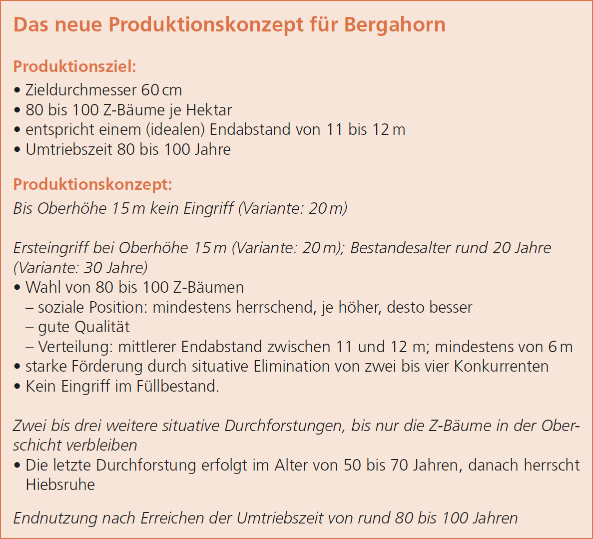 Aufgrund der längeren möglichen Umtriebszeit können 80 bis 100 Z-Bäume bei mittleren Abständen von 11 bis 12 m ausgewählt und gefördert werden. Die Art des Eingriffs und die Kosten unterscheiden sich nicht von Eschenbeständen. Möglich wären beim Bergahorn aber auch etwas spätere Eingriffe, beispielsweise bei Oberhöhe 20m.