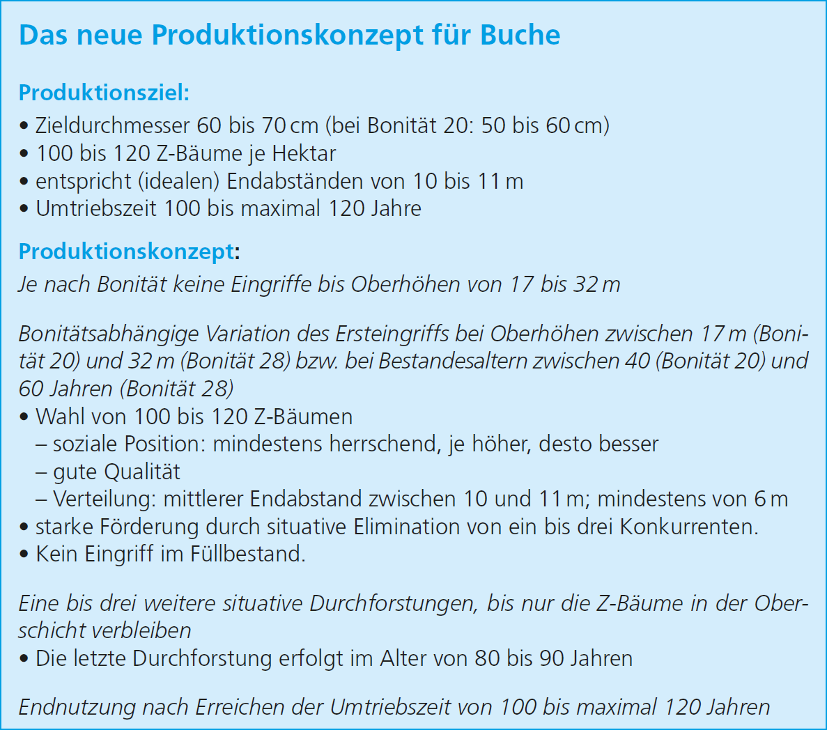 Bei guten Bonitäten können Buchenbestände problemlos 60 Jahre lang unbehandelt bleiben. In Alter 60 beträgt der BHD der Z-Bäume rund 30 cm. Wenn man von einer Jahrringbreite von 4mm nach dem Beginn der Durchforstungen ausgeht, wird trotz sechs Jahrzehnten unbehandelter Entwicklung bereits im Alter von rund 100 Jahren der Zieldurchmesser erreicht.