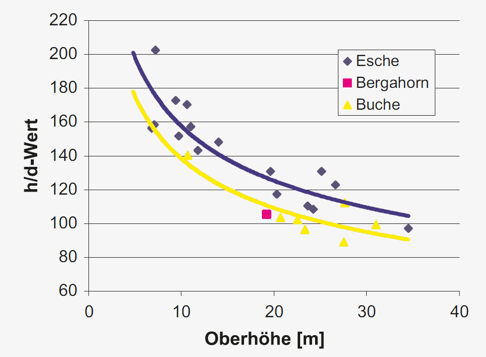 - Zu beachten ist, dass die Schlankheit von Bäumen nicht nur durch die Konkurrenz (Seitendruck), sondern auch durch Beschattung (Schirmdruck) beeinflusst wird. Bei Beständen in kleinen Lücken oder an Steilrändern (Schiefstand und Schlankheit) muss das Problem nicht durch teure Pflege, sondern durch eine rechtzeitige Erweiterung der Verjüngungsflächen angegangen werden.
