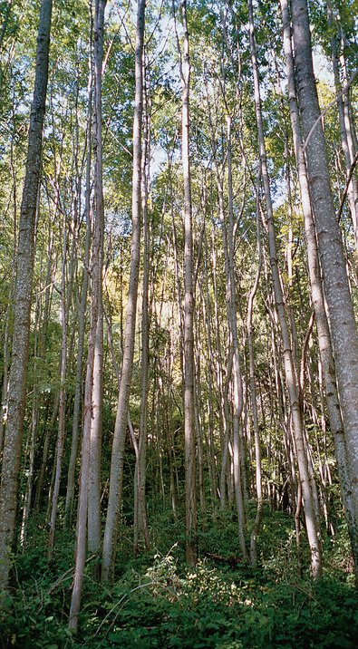 Abb. 3 - 15-jährige Eschendickung, die Stammzahl beträgt ungefähr 30 000/ha. Damit das Produktionsziel erreicht wird, braucht es rund 100 schöne Eschen, dies sind nur 0,3% der jetzigen Stammzahl (Konzentrationsprinzip). Die Entwicklung verläuft nach Wunsch, Eingriffe sind im Moment noch nicht nötig (Naturautomation). Korporation Unter-Affoltern ZH.