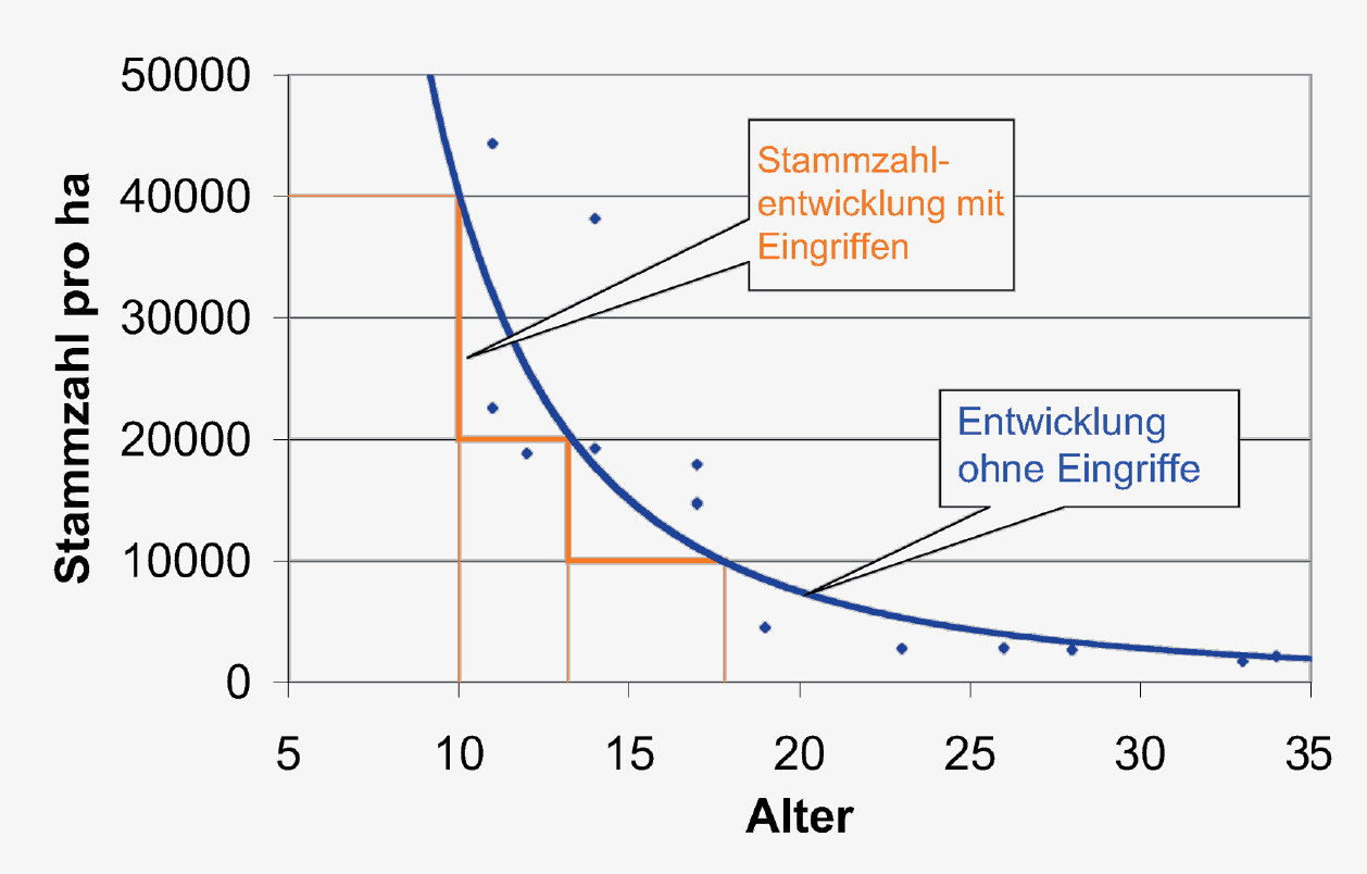- Durch die frühen und regelmässigen Eingriffe ("Erdünnerungen" in der Dickung) werden viele Bäume entnommen, welche sowieso absterben würden (vgl. Abb. 4).