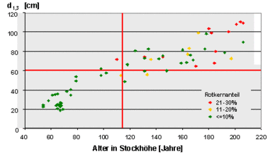 Zwar waren diese Buchen nicht frei von Rotkern, anhand des Untersuchungsmaterials ließ sich jedoch eine Durchmesser/Altersgrenze von 60 cm und 120 Jahren bestimmen, unterhalb derer eine Entwertung durch Rotkern noch kaum zu befürchten ist.