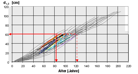 Die Ergebnisse zeigen, dass unter diesen Voraussetzungen für einen Durchmesser von 60 cm etwa 90, für 80 cm 120-130 Jahre erforderlich sind. Die Standraumansprüche von Buchen mit einer derartigen Entwicklung sind allerdings so groß, dass die standörtlich mögliche Flächenproduktivität deutlich unterschritten wird.