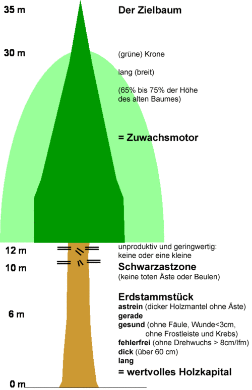Als anzustrebendes Ergebnis wurde bestimmt, dass in einer möglichst kurzen Zeit gesundes, astreines Stammholz starker Dimension in einer bestimmten Länge erzeugt werden soll. Mit dieser Vorgabe wurde der Ziel-Baum auf maximal 10 m Erdstamm-Länge präzisiert. Offen blieb, wie dieses Z-Baum-Ziel zu erreichen ist und zu welchen Folgen es führt.