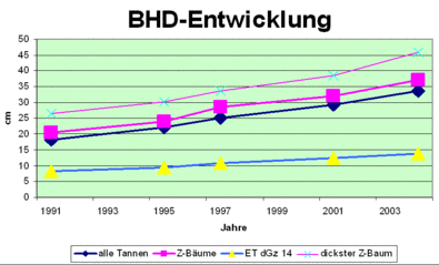 Abb. 3a: Tannen der VFl. 07 im Zeitraum eines Alters von 30 bis 43 Jahren. Die Entwicklung des BHDs im Vergleich zur Ertragstafel HAUSSER 1956 mit dGz 14.