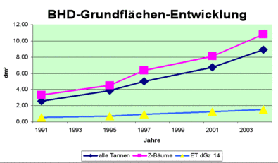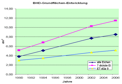 Die Krone der geförderten Z-Bäume wird größer, deren Baumzuwachs steigt. Weil der Durchmesser dicker wird, muss der Baumzuwachs ständig steigen, wenn die Jahrringbreite gleich bleiben soll. Mit dem dicker werdenden Stamm nimmt die Jahrringbreite ab, weil der Zuwachs dauerhaft nicht so stark wie die Stammoberfläche ansteigt.
