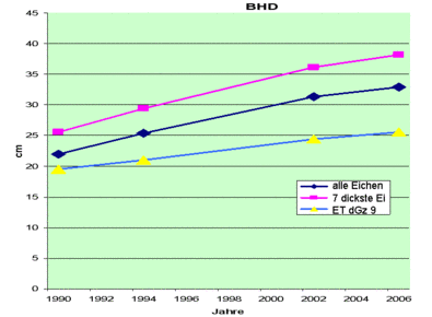 Selbst wenn für Eichen-Stammholz mit Jahrringbreiten von mehr als 3 mm weniger bezahlt wird, als für engringiges Holz, wiegt der höhere Erlös selten den Einfluss des Durchmessers auf. Bei gleicher Produktionsdauer (von 100 Jahren) wachsen bei