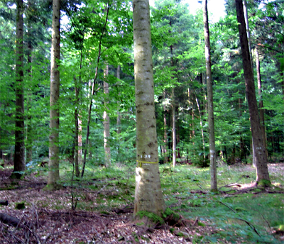 Abb. 3: Astfreier Stamm einer 47-jährigen Tanne der VFl. 07. Von 1991 bis 2006 erfolgten vier Durchforstungen (zusätzlich zu einzelnen Sturmverlusten). Die Stammzahl ist etwa halb so groß wie nach der Ertragstafel, G/ha zwischen 25 und 29 m² (statt über 30 m² nach der Ertragstafel). Aufgrund des Lichtes setzt die Naturverjüngung ein, allerdings leidet sie unter Rehwildverbiss. Die Z-Bäume sind geästet.