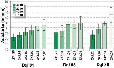 Der kritische Qualitätsgrenzwert hinsichtlich Aststärke liegt für gesund verwachsene Äste bei 4 cm. Nur bei Ausgangsbaumzahlen von unter 1000 Stück je Hektar wird dieser überschritten (Abbildung 3). Erfahrungen bei der Vermarktung grobastigen Douglasienholzes zeigen, dass auch wesentlich grobastigeres Material technisch gut verwertbar ist und akzeptable Marktpreise erzielt werden – vorausgesetzt, es handelt sich um gesund verwachsene Äste.