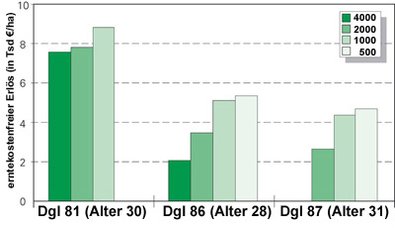 Kalkulationen zur Wertleistung 30-jähriger Bestände zeigen, dass die bei geringeren Ausgangsbaumzahlen verbesserte Durchmesserleistung die etwas reduzierte Gesamtwuchsleistung bei weitem überkompensiert. Selbst unter Annahme ungünstigerer Qualitätsmerkmale und erhöhter Erntekosten ist die Wertleistung aus erntekostenfreien Holzerlösen in Beständen geringerer Ausgangsbaumzahlen höher (Abbildung 4). Die zusätzliche Einbeziehung der reduzierten Kulturkosten verstärkt diese Unterschiede zugunsten der geringeren Ausgangsbaumzahlen. Da sich bei einer Ausgangsbaumzahl von 500 Douglasien je Hektar grenzwertige Entwicklungen bei der Holzqualität (Aststärke, Jahrringbreite) abzeichnen, werden Ausgangsbaumzahlen zwischen 1000 – 2000 Douglasien je Hektar für eine wertleistungsoptimale Entwicklung empfohlen.