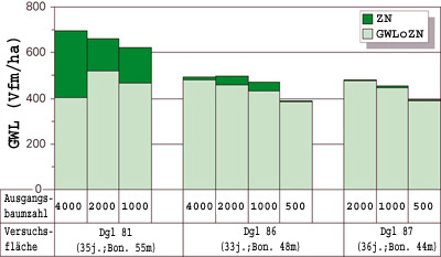 Abb. 2: Koordinierter Douglasien-Standraumversuch: Gesamtwuchsleistung (GWL) nach Ausgangsbaumzahlen auf drei verschiedenen Versuchsflächen im Alter 33 – 36 Jahre; der Anteil zufälliger Nutzung (ZN) an der GWL ist gesondert ausgewiesen.