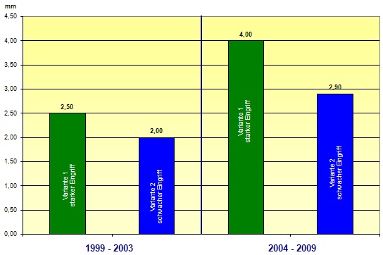 Die verschieden starken Durchforstungseingriffe haben bereits gezeigt (Abbildungen 4 und 5), dass sich der Unterschied der durchschnittlichen Jahrringbreite bei den Z-Bäumen zwischen der Variante 1 und 2 in der zweiten Periode (2004 – 2009) gegenüber der ersten (1999 – 2003) verdoppelt hat (Abbildung 5). Sollte sich dieser Mehrzuwachs bei den nächsten Messungen auch weiterhin bestätigen, wird man davon ausgehen können, dass die Wahl der Eingriffsstärke in Variante 1 zur Produktion von überwiegend hochwertigem Sägerundholz und in Variante 2 von Blochen mit hohem Furnieranteil geeignet ist.