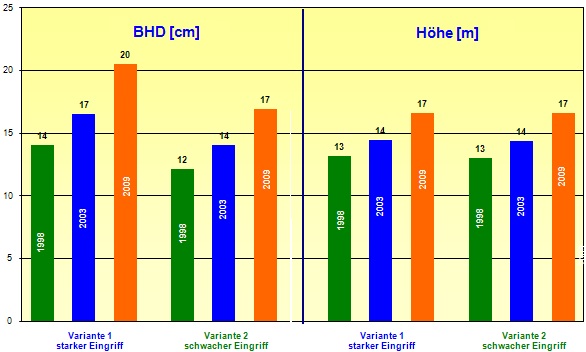 Auf den Flächen 1 und 2 wurden im Herbst 1999 Erstdurchforstungen mit verschiedenen Eingriffsstärken durchgeführt. Die Variante 3 wurde als Nullfläche undurchforstet belassen. Die Anzahl der Z-Bäume in den Varianten 1 und 2 beträgt ca. 80 Bäume pro Hektar (Tabelle 1).