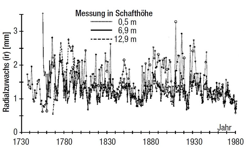 Abb. 1: Variation des jährlichen Radialzuwachses einer Eiche in verschiedenen Schafthöhen aus dem Forstamt Johanniskreuz, die als Wertholz verkauft wurde.