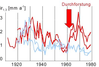 Abb. 4: Radialzuwachsreaktion (ir1,3) von zwei Eichen , die im Alter von ca. 40 Jahren von bedrängenden Buchen befreit wurden. Im Vergleich dazu ist auch der Zuwachs von zwei weiterhin von Buchen bedrängten Eichen abgebildet. Der maximale Mehrzuwachs wurde erst einige Jahre nach der Freistellung erreicht in einem Jahr, in dem auch für die nicht freigestellten Eichen besonders günstige Wachstumsbedingungen herrschten.