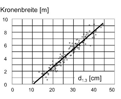 Das enge Verhältnis zwischen der horizontalen Kronenausdehnung und dem Schaftdurchmesser wird durch die Standortsgüte nur wenig beeinflusst. In gleichaltrigen Beständen besteht ein linearer Zusammenhang zwischen Kronendurchmesser und Schaftdurchmesser (Abb. 5). Durch eine zunächst zurückhaltende und später zunehmende Förderung gut veranlagter Bäume wird nicht nur eine mit dem Alter oft einhergehender Radialzuwachsschwund vermieden, sondern auch ein hoher Anteil astfreien Holzes erzielt.