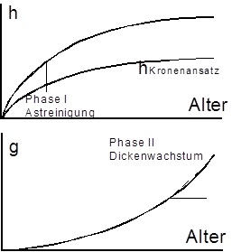 Die beiden wichtigsten, durch die Art der Bewirtschaftung steuerbaren Größen sind neben der Auswahl besonders vielversprechender Z-Bäume die Astreinigung und das Dickenwachstum. Aufgrund der Dynamik des Höhen- und des Grundflächenwachstums der Bäume (siehe Abb. 2) liegt es nahe, die Wachstumssteuerung in zwei Phasen aufzuteilen: In der ersten Phase, in welcher der Baum schnell in die Höhe wächst, wird die Astreinigung gefördert und in der zweiten Phase, in der das Grundflächenwachstum stark ansteigt, wird das Dickenwachstum des inzwischen äußerlich astreinen Schaftes gefördert.