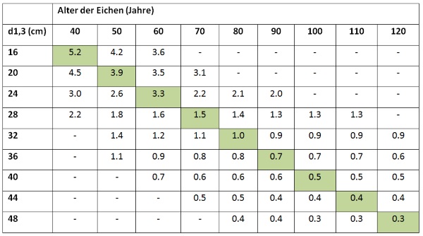 Tab. 3: Anzahl der Durchforstungsbäume je Z-Baum im kommenden Jahrzehnt. Grün unterlegt sind die Werte für einen Radialzuwachs von 2,0 mm.