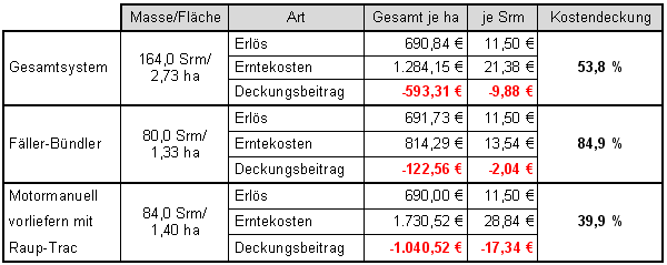 Auf der laubholzgeprägten Fläche werden je ha 23,1 Fm (60,1 Srm) entnommen, wobei 80 % Weichlaubhölzer sind. Die durchschnittliche Höhe des ausscheidenden Bestandes ist 12,5 m, der durchschnittliche BHD beträgt 12,5 cm. Tab. 1 zeigt die betriebswirtschaftlichen Ergebnisse des Eingriffes. Dabei wird die Kombination aus maschinellen und motormanuellen Einsatz als Gesamtsystem dargestellt, in den unteren Zeilen wird der Eingriff getrennt nach dem jeweiligen Arbeitssystem betrachtet. Dabei fällt auf, dass für das Gesamtsystem nach Abzug der Erlöse noch Kosten von knapp 600 € pro ha anfallen. Betrachtet man hingegen nur den Bereich, in dem ausschließlich die Maschine arbeitet, ist festzustellen, dass je ha nur noch Kosten in Höhe von ca. 120 € entstehen. Hier können fast 85 % der Kosten durch die Erlöse aus dem Verkauf von Hackschnitzeln gedeckt werden. Im Mittelblock, wo motormanuell Energieholz bereitgestellt wird, sind die Kosten mit über 1.000 € je ha am höchsten.