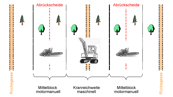 Als Datenbasis dienen zwei teilmechanisierte Jungbestandspflegemaßnahmen in einem Laubholz- und einem Nadelholzbestand des Stadtwaldes Albstadt: Ein Fäller-Bündler (Abb. 1) bearbeitet von der Rückegasse aus den Kranbereich; den Mittelblock bearbeiten Forstwirte, die das gefällte Holz mit einem Raup-Trac zur Gasse vorliefern. Anschließend wird es zum Fahrweg gerückt und dort gehackt. Das Arbeitsverfahren ist in der Abb. 2 systematisch dargestellt.