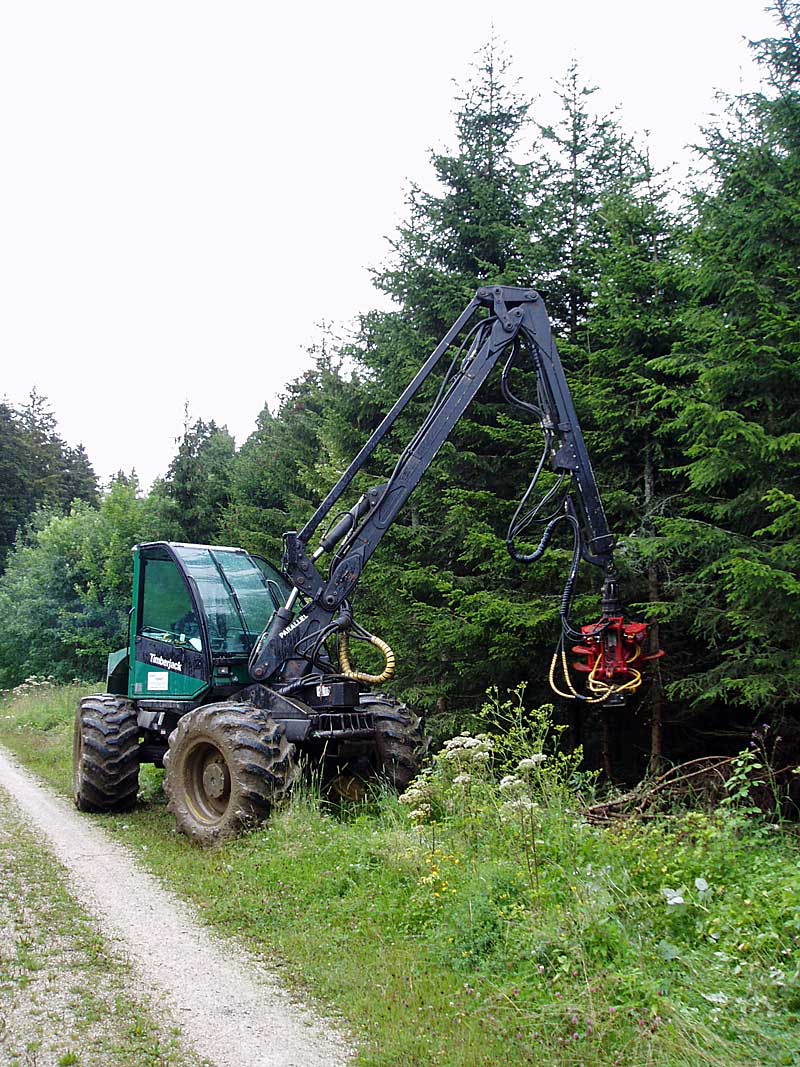 Beim Eingriff im Nadelholzbestand ergibt sich ein ähnliches Bild. Es werden 29,5 Fm je ha entnommen, davon sind 87 % Fichten. Die mittlere Höhe des ausscheidenden Bestandes beträgt 11,1 m, der mittlere BHD 12,2 cm. Das Gesamtsystem verursacht Kosten von etwas über 600 € je ha, die Maschine kann ebenfalls sehr kostengünstig arbeiten. Die Handarbeit verursacht erwartungsgemäß auch hier die höchsten Kosten.