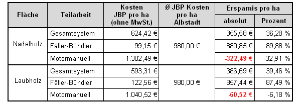 Abschließend stellen die Autoren fest, dass die Jungbestandspflege in den beiden Beständen durch den teilmechanisierten Eingriff deutlich günstiger ist, als die sonst üblichen Maßnahmen in Albstadt und Baden-Württemberg. Im Laubholzbestand liegen die Jungbestandspflegekosten um knapp 40 %, im Nadelholzbestand um ca. 36 %, unter den durchschnittlichen Jungbestandpflegekosten von Albstadt.