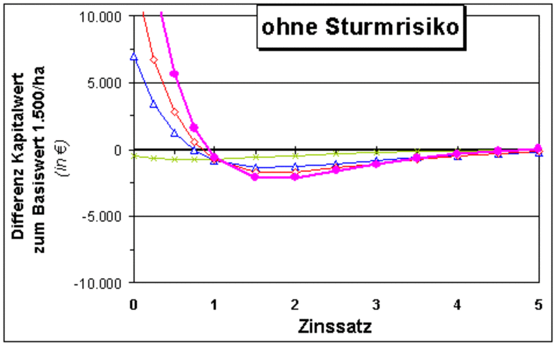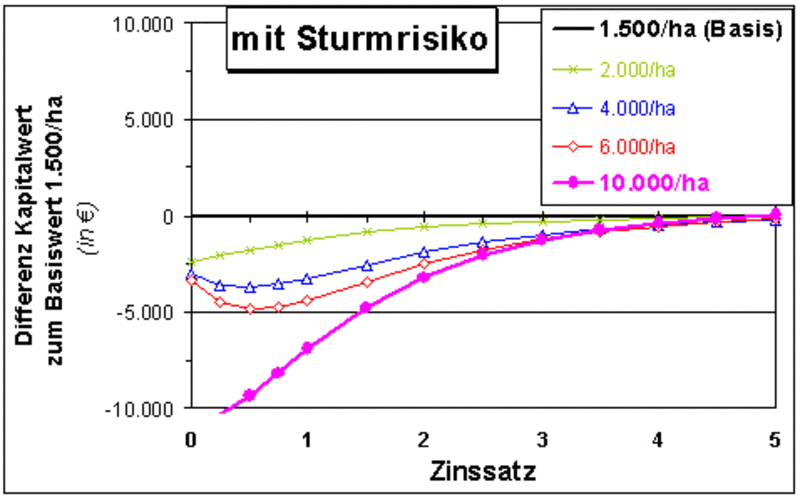 Bei ungestörter Produktion führen die zu Produktionsbeginn eingesparten Pflegekosten der baumzahlreichen Varianten bei sehr niedrigen kalkulatorischen Zinsfüßen zwar zu günstigeren Ergebnissen. Bereits ab einem Zinssatz von 1 % führt jedoch die Reduktion auf 1.500 Fi/ha zu den günstigsten Kapitalwerten (Abb. 4). Der Grund ist die raschere Durchmesserentwicklung, die deutlich früher eingehende und damit weniger stark diskontierte Erlöse ermöglicht. Noch deutlicher wird der positive Einfluss einer anfänglichen Reduktion auf den Kapitalwert bei Einbeziehung des Sturmrisikos: der energischste Pflegeeingriff führt dann bei allen kalkulierten Zinssätzen zu klar überlegenen Kapitalwerten. Umgekehrt bewirkt der Verzicht auf Pflegemaßnahmen massive Einbussen.