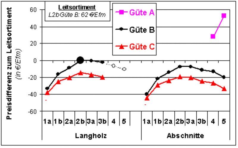 Verwendet wurden die in Abb. 1 dargestellten Preise mit einem aktuellen Preis für das Leitsortiment L2b (Güte B) von 62 €/Efm unterstellt [1]. Die C-Abschläge vom B-Preis liegen abhängig von der Stärkeklasse zwischen 13 % (L/SL1a) und 25 % (L3b, SL5).