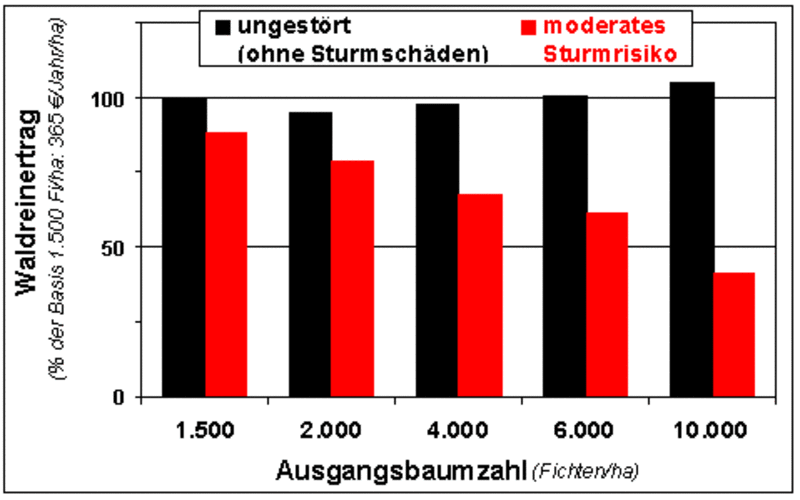Bei der Beurteilung des verwendeten Risiko-Szenariums ist zu berücksichtigen, dass es das Sturmrisiko ausschließlich aus der Bestandeshöhe schätzt. Die bei geringeren Ausgangsbaumzahlen günstigere Wurzelentwicklung bleibt dabei unberücksichtigt! Nicht berücksichtigt sind zudem andere Risikofaktoren wie beispielsweise Borkenkäfer oder Fäulen, deren Bedeutung tendenziell ebenfalls mit steigender Produktionsdauer zunehmen.