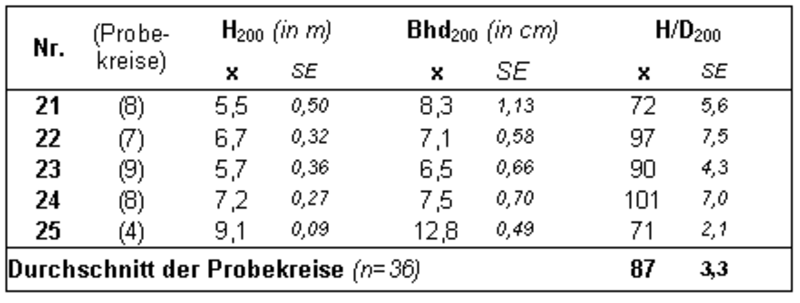 Tab. 2: Mittelwerte der jeweils höchsten Fichte in Probekreisen auf 1990 durch Sturm freigestellten, unbehandelten Fichte-Tanne-Naturverjüngungen (Datenquelle [11]; dargestellt sind nur solche Probekreise, in denen bei der Aufnahme 2003 eine Fichte den höchsten Baum stellte.