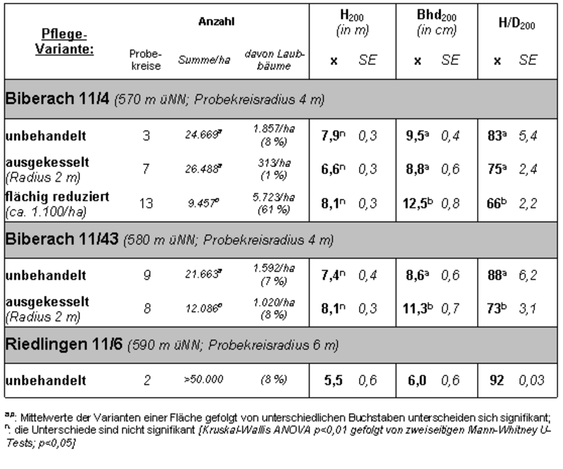 Im Frühjahr 2001 erfolgten Probekreis-Aufnahmen in drei 1990 durch Sturm freigestellten baumzahlreichen Fichten-Naturverjüngungen ("Bürstenwüchse"). In Biberach waren. bei einer Höhe der Bürstenwüchse von ca. 1 – 2 m 1994 im Rahmen eines Stützpunkt-Praxisversuchs folgende Varianten einer Jungbestandspflege angelegt worden: a) flächige Reduktion auf ca. 1.100 Fichten/ha, b) Auskesselung im Radius von 2 m, c) keine Maßnahmen (unbehandelt). Aufgrund der nicht systematischen Anlage wiesen die Pflegevarianten sehr unterschiedliche Flächenausstattungen auf. Die Anzahl aufgenommener Probkreise variierte daher stark. Zusätzlich wurden die Probekreis-Aufnahmen in 1990 freigestellten, unbehandelten Fichte-Tanne-Naturverjüngungen [11] herangezogen; verwendet wurden die Daten der Probekreise, in denen zum Zeitpunkt der Aufnahme (2003) eine Fichte den höchsten Baum bildete. Da die Aufnahmen auf die höchsten Bäume im Probekreis beschränkt wurde, liegen keine Angaben zur Baumzahl in diesen Naturverjüngungen vor.