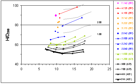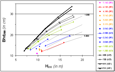 Abb. 2: Bhd (oben) und H/D (unten) in Abhängigkeit der Höhe der 200 höchsten Fichten je Hektar in den Pflanzverbandsversuchen Fichte 387 und Fichte 423 sowie bei Simulationen mit einem Wachstumssimulator [20].